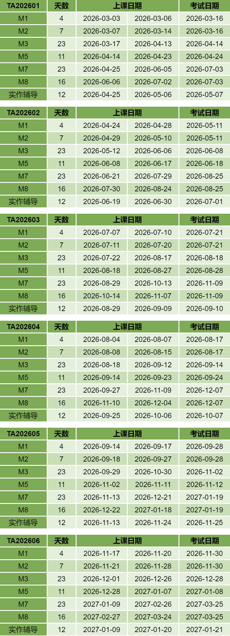 2026年TA全程班/补差班培训日程安排