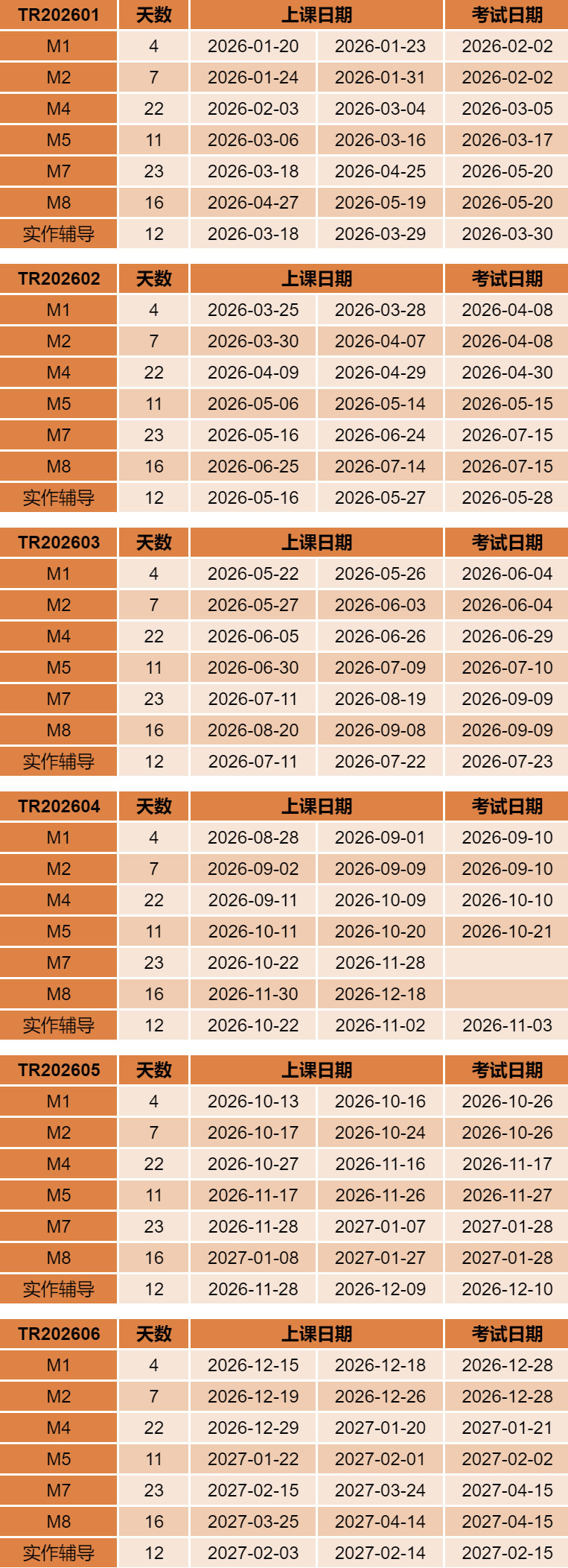 2026年TR全程班/补差班培训日程安排
